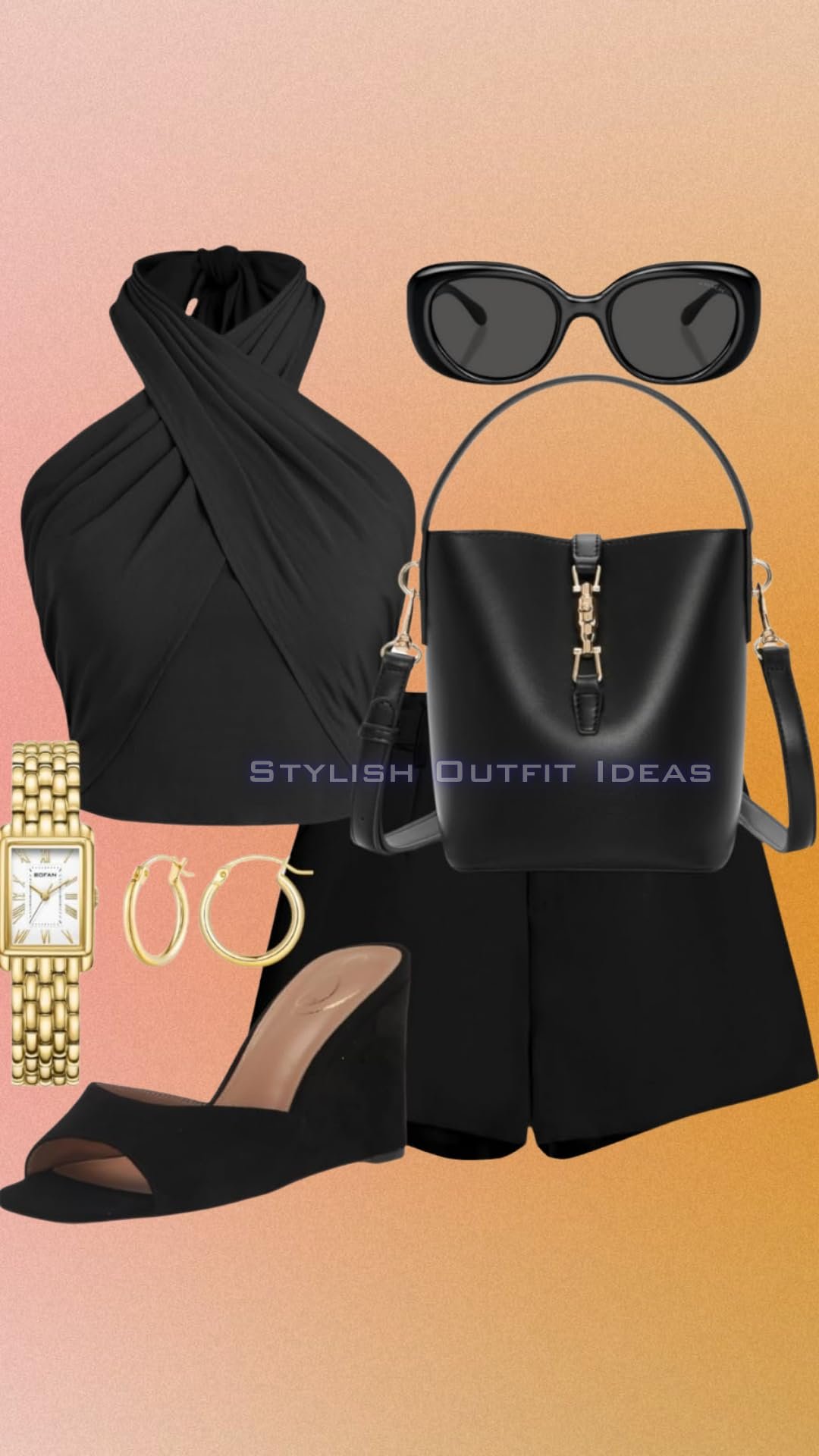 Discover how to style an all-black halter top outfit with tailored shorts, gold accessories &…