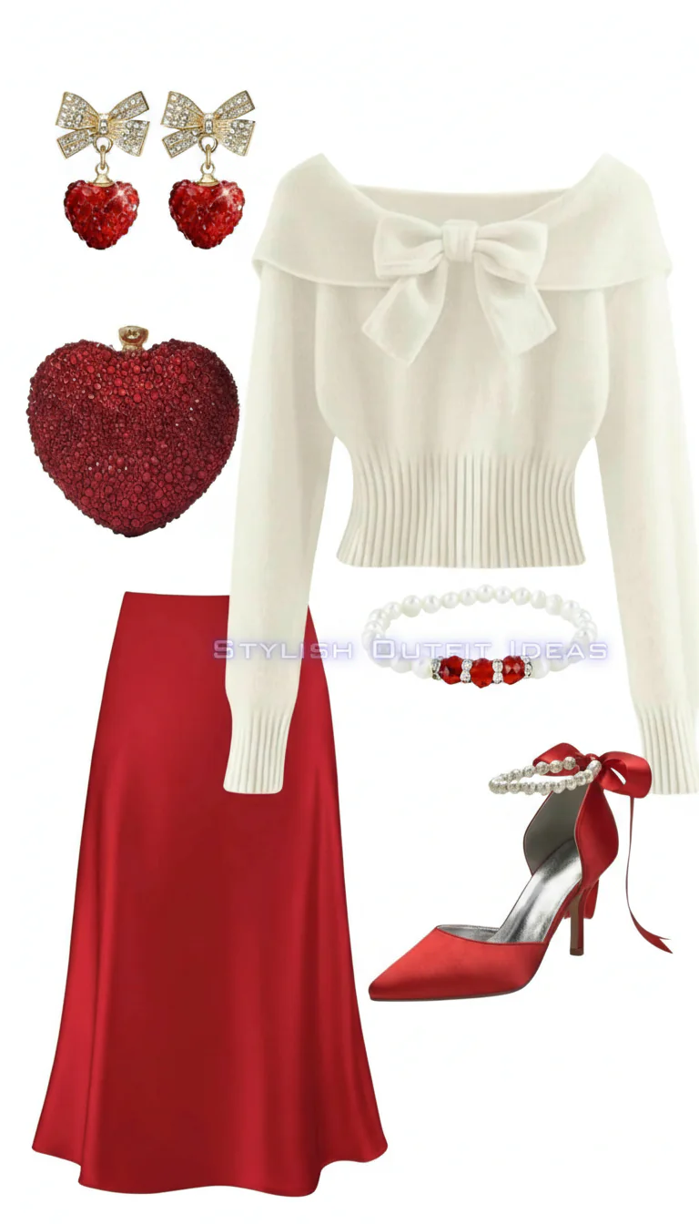 Shop this stunning Valentine’s Day 2026 outfit! Red satin midi skirt, white bow sweater, pearl…