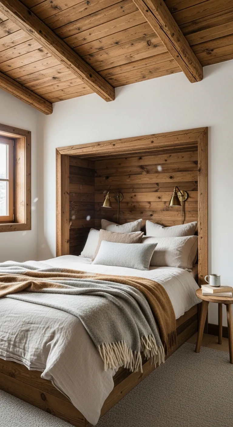 If you’re building or renovating, consider adding exposed beams, tongue-and-groove ceiling planking, or built-in box bed alcoves that create architectural interest. For existing spaces, you can suggest these elements through removable treatments: faux wood beams, peel-and-stick planking on accent walls, or furniture arrangement that mimics the box bed concept by flanking your bed with tall bookcases or wardrobes. Pair these rustic architectural elements with refined modern furnishings to avoid cabin kitsch—crisp white bedding, contemporary lighting, and minimal accessories keep the look elevated. The combination of rough-hewn architectural detail with polished modern elements creates sophisticated mountain-modern aesthetic that feels both cozy and luxurious.