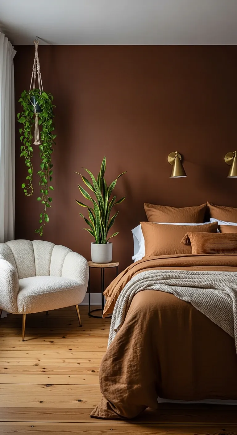 Introduce brown gradually if you’re hesitant about commitment: start with textiles—a chocolate brown duvet cover, caramel throw pillows, or a cocoa-toned area rug. Graduate to furniture with brown wood tones, woven leather accents, or upholstered pieces in warm brown hues. The most confident approach is a brown accent wall, which provides dramatic impact while leaving remaining walls neutral for balance. Brown pairs beautifully with cream, white, sage green, terracotta, and brass metallics. It grounds airy spaces, warms cool ones, and provides a sophisticated backdrop that never feels sterile. Unlike trendy colors that date quickly, brown has timeless staying power—it’s been beautiful for centuries and will remain so.