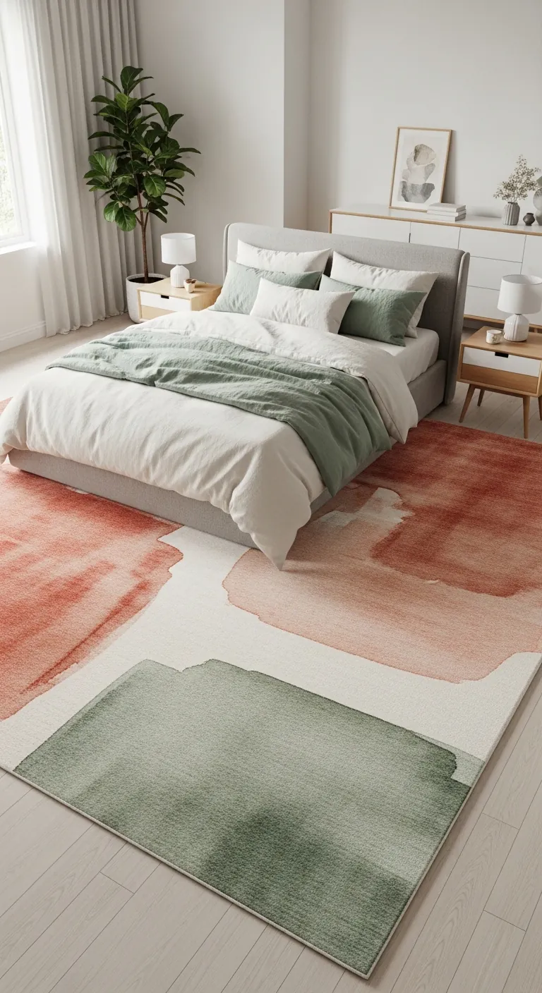 Choose an illustrated rug that speaks to your aesthetic—abstract expressionism for modern spaces, botanical line drawings for organic rooms, geometric illustrations for contemporary styles. Size matters: the rug should extend at least 18-24 inches beyond each side of your bed, or fill a designated seating area completely. Keep other elements relatively simple so your statement rug can shine—neutral bedding, minimalist furniture, and uncluttered walls let the floor art breathe. This approach works especially well in rental spaces where wall treatments are limited; you can establish entire aesthetic through flooring alone. It’s personality without permanence, art you can roll up and take with you.