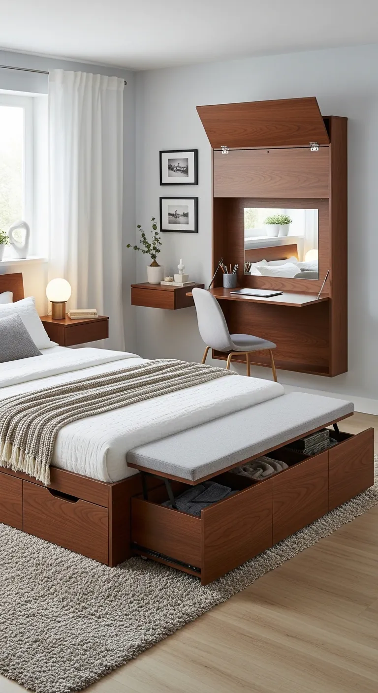 Prioritize pieces that serve multiple purposes: a storage bed eliminates the need for additional dressers, floating nightstands leave floor space for cleaning and visual breathing room, an upholstered bench provides seating and storage while functioning as a visual foot-of-bed anchor. Look for furniture that scales appropriately to your space—overstuffed pieces overwhelm small rooms, while properly proportioned furniture creates the illusion of more space. Keep the color palette cohesive and minimize decorative objects to reduce visual clutter. Use vertical space with tall, narrow shelving rather than wide, low pieces that consume floor area. The goal is functionality that doesn’t announce itself—storage and workspace that integrate seamlessly into a cohesive design rather than making the room feel like a puzzle of different purposes.