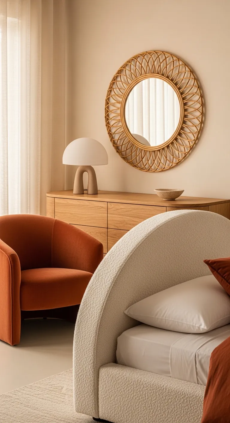 Sharp edges and rigid geometry are giving way to soft curves and organic forms that promote relaxation. Arched headboards, curved furniture silhouettes, round mirrors, and sculptural lighting with flowing lines create a gentler visual environment that feels inherently calming. This shift reflects our growing understanding of how physical environment affects emotional state.