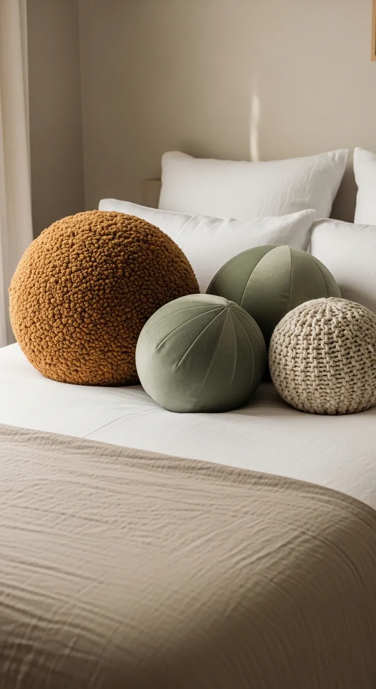 One of 2026’s most playful trends is the ball pillow—spherical cushions in velvet, faux fur, or textured fabrics that add whimsical sculptural interest to beds and seating. These aren’t functional support pillows; they’re pure design elements that introduce curves, texture, and personality without taking themselves too seriously.
