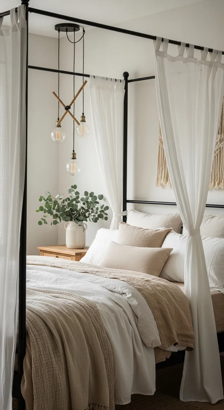 Choose your frame based on your overall aesthetic: streamlined wood or metal for modern spaces, carved or turned posts for traditional rooms. The drapery makes the magic—lightweight linen or cotton voile adds romance without heaviness, while heavier velvet or wool provides privacy and warmth. You don’t need to fully enclose the bed; casually tied panels or fabric draped only at the headboard creates visual interest while maintaining openness. This look pairs beautifully with the biophilic trend—natural wood frames with neutral draping and plenty of plants creates an elevated, organic sanctuary. It’s theatrical without being fussy, a statement that says you value beauty and comfort equally.