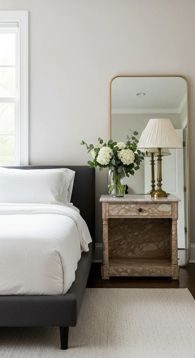 The key to vintage luxe is balance: pair one or two statement antique pieces with contemporary furnishings to avoid a museum effect. Look for quality materials that have genuine presence—a marble nightstand, a carved wooden chest, a mid-century modern dresser, or an ornate vintage mirror. These pieces should feel earned, not matched. Mix metals freely: brass with silver, copper with matte black, gold with nickel. Layer in modern elements to ground the look—crisp contemporary bedding, minimalist lighting, or abstract art. The contrast between old and new creates a collected-over-time aesthetic that feels both personal and elevated. It’s a room with depth, history, and soul.