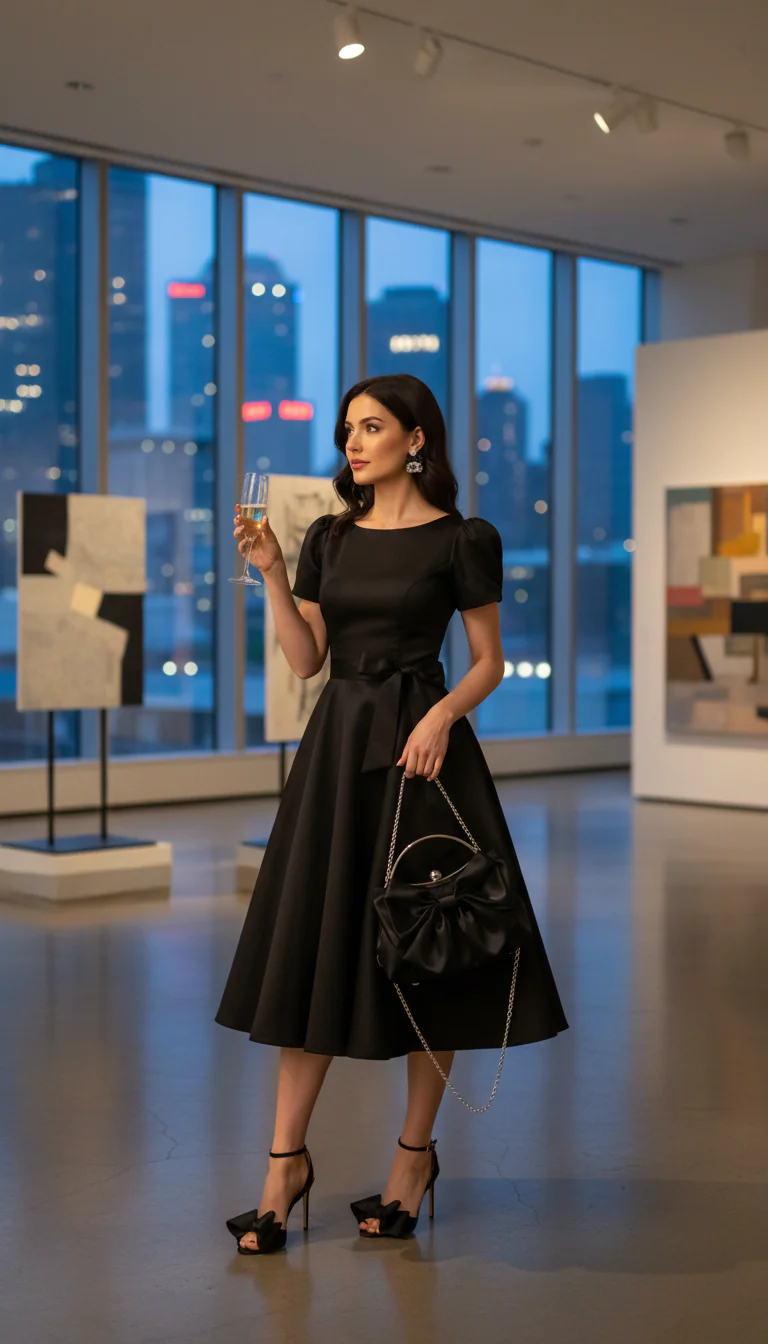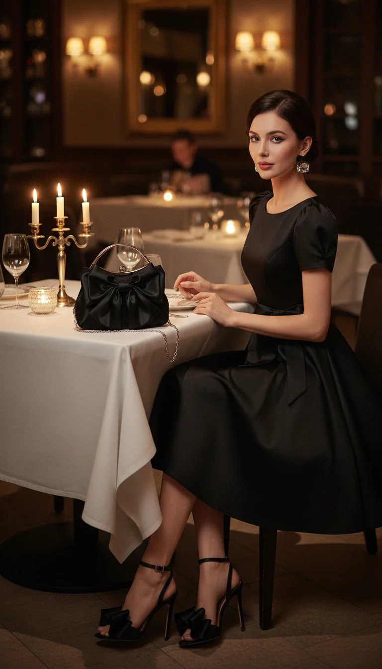 Fine dining establishments deserve fashion that matches their ambiance. This outfit delivers refined elegance that respects the upscale atmosphere while allowing your personality to shine through the vintage-inspired details. The bow accents throughout—from earrings to shoes to clutch—create a cohesive, intentionally styled look that shows thoughtfulness and attention to detail. The black color palette ensures you look polished and appropriate for even the most exclusive restaurants.