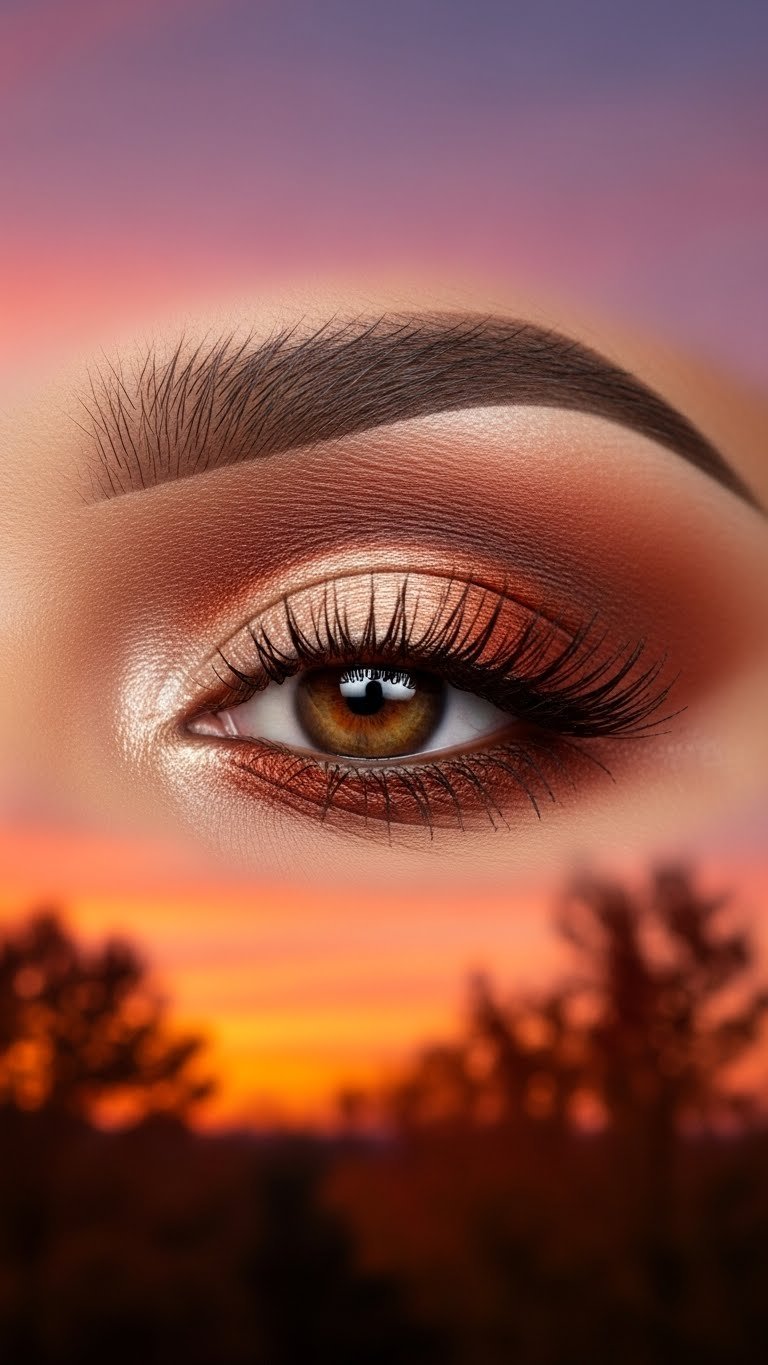 Pack rusty orange or copper shadow on the inner and outer corners of the lid, leaving the center bare at first. Then apply a lighter champagne or rose-gold shimmer to the center of the lid, blending slightly into the rust shade for a halo effect. Smudge a bit of rust along the lower lash line to complete the frame. Pair with a warm neutral blush and a sheer nude or peach lip to keep focus firmly on the eyes. This look is dramatic yet seasonal, ideal for festivals, weddings, or evening events.