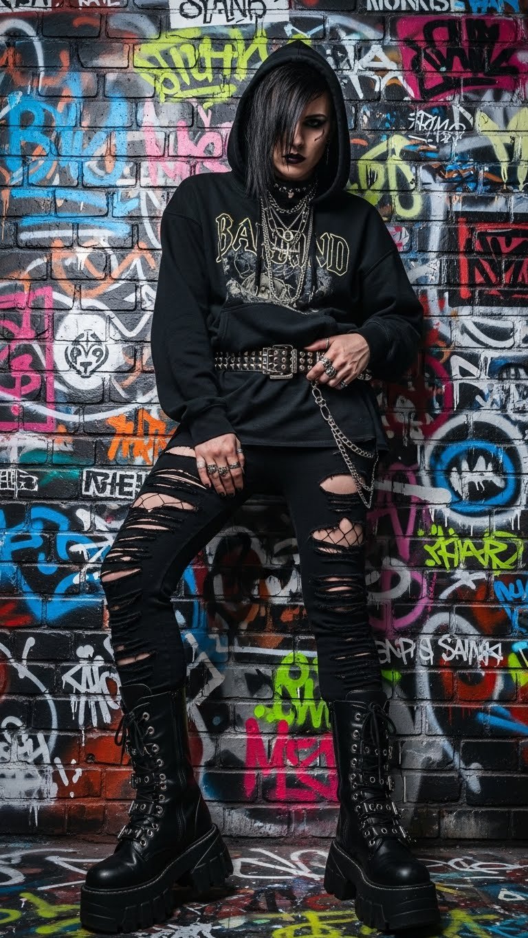 Bring back the Y2K rebellion with ripped leggings, oversized band hoodies, and combat boots. Add silver jewelry and a dark lipstick for attitude.