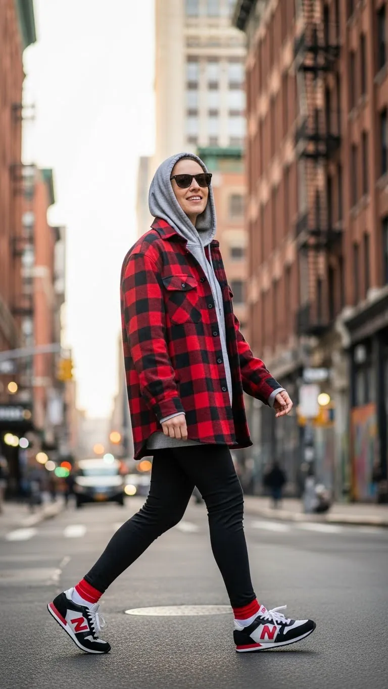 Wear your oversized hoodie under an oversized flannel or plaid shirt for 90s revival style. Balance the loose top proportions with fitted leggings.