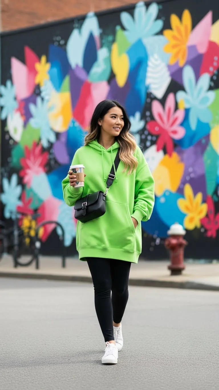 Bright color-blocked hoodies make your outfit pop against neutral leggings. Opt for neon greens, hot pinks, or cobalt blue for a streetwear edge that dominates 2026 trends.