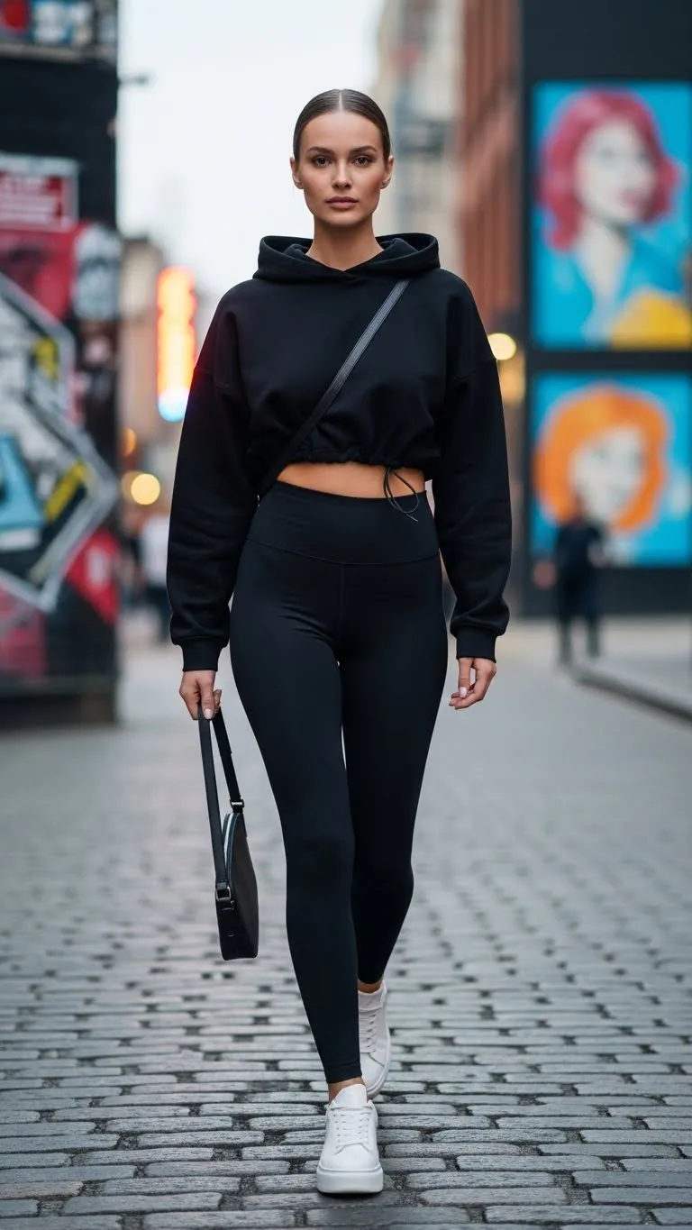 Monochrome outfits never go out of style. Pairing a black oversized hoodie with matching black leggings creates a slimming, elongated silhouette. Add chunky white sneakers or platform slides to contrast and bring a street-ready vibe.