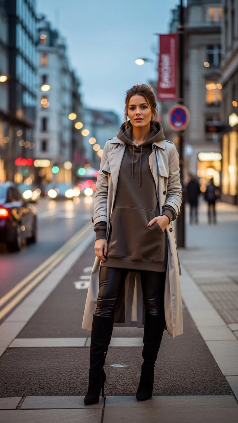 Blend casual with dressy by choosing a beige oversized hoodie and faux leather leggings. Add heeled boots and a sleek handbag for an upscale everyday outfit.