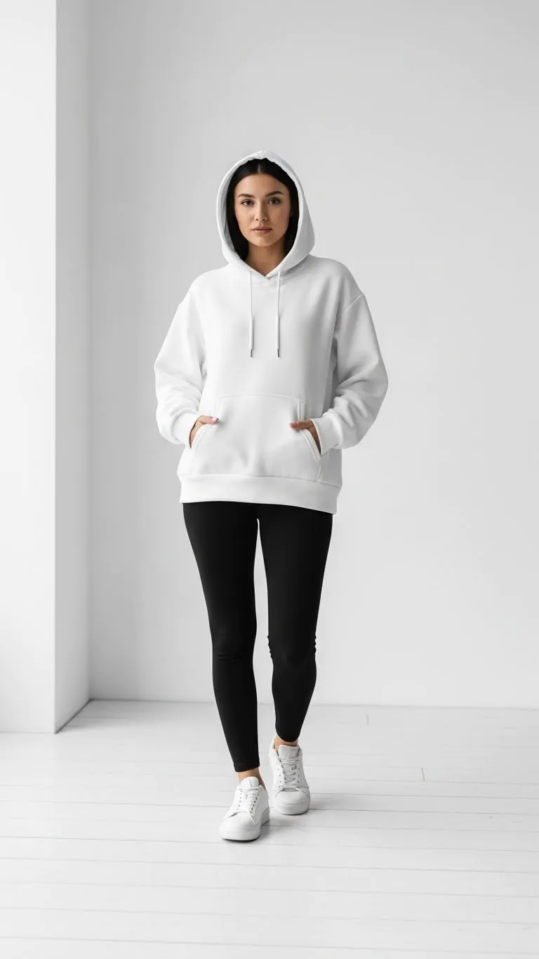 Stick to the basics: black leggings, white oversized hoodie, and clean accessories. It’s the go-to 2026 minimalist uniform that communicates confidence through simplicity.