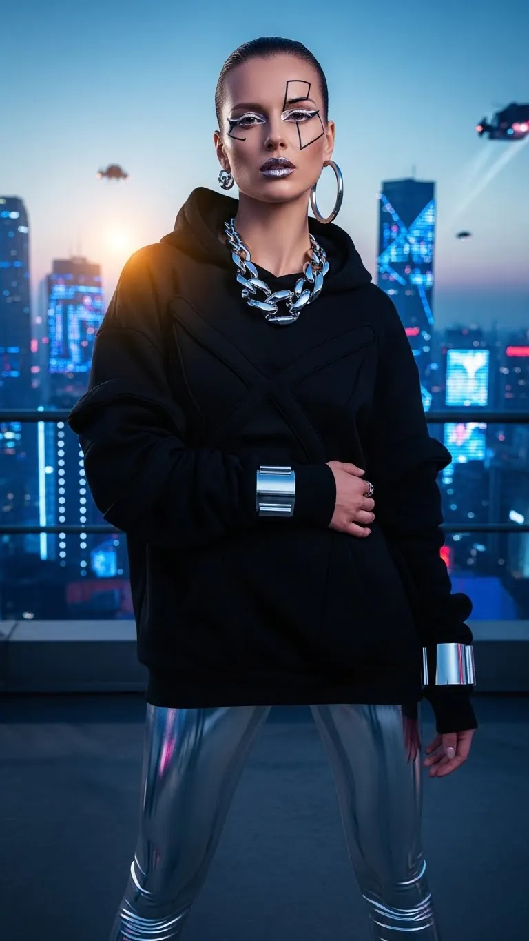 Go bold with designer oversized hoodies paired with glossy or ribbed leggings. Mix textures — velvet, metallic sheen, or reflective materials — for a futuristic high-fashion twist.