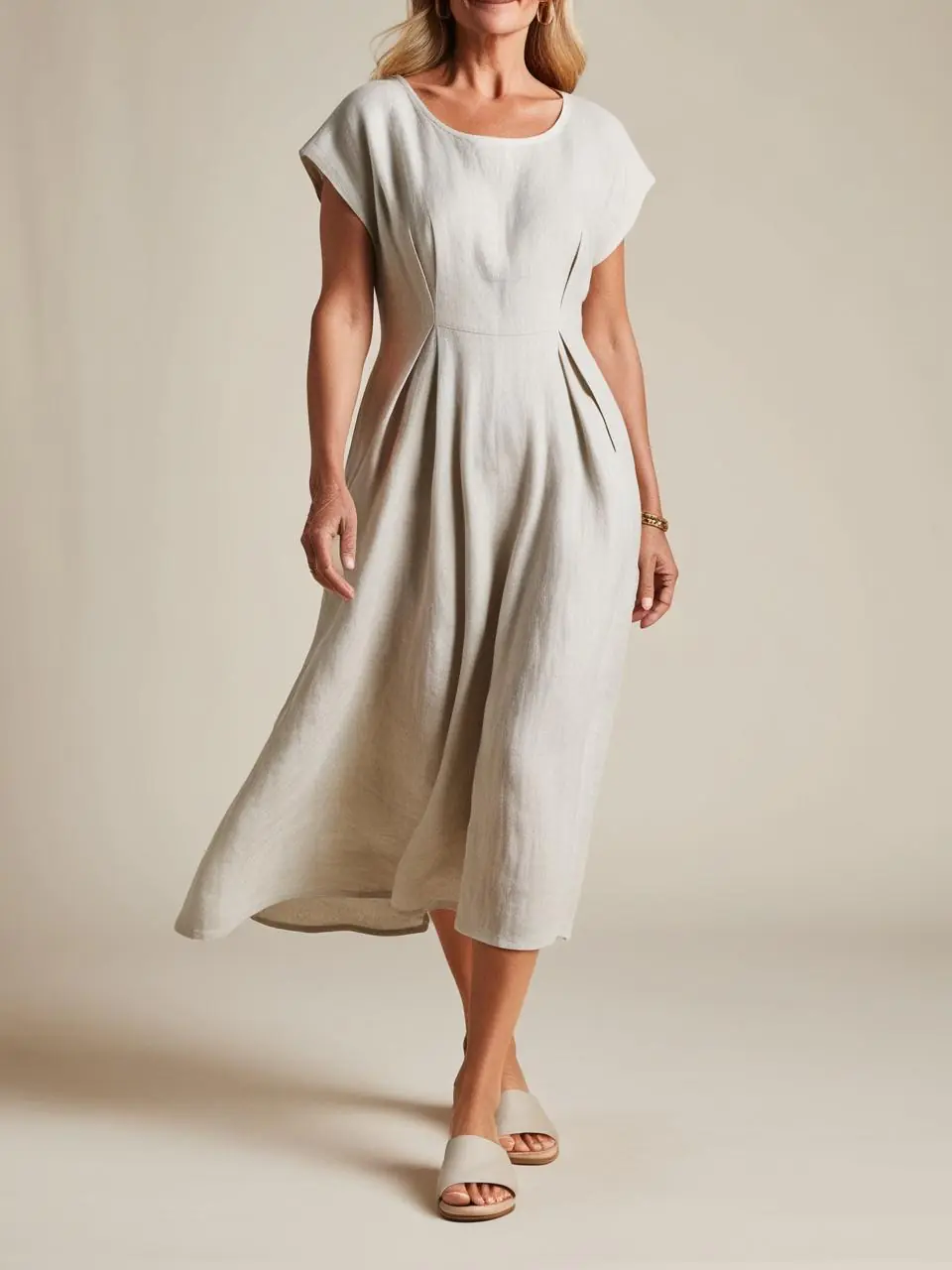 Why It Works: A linen-cotton midi dress offers coverage, airflow, and polish. Pair with nude slides for elongating legs.