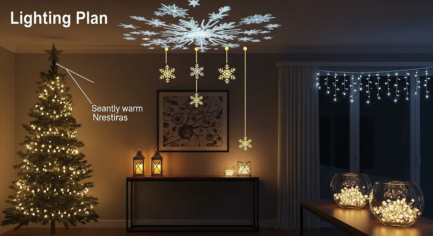 - Garland and window accents: repeat snowflake and flocked elements to guide the eye around the room.