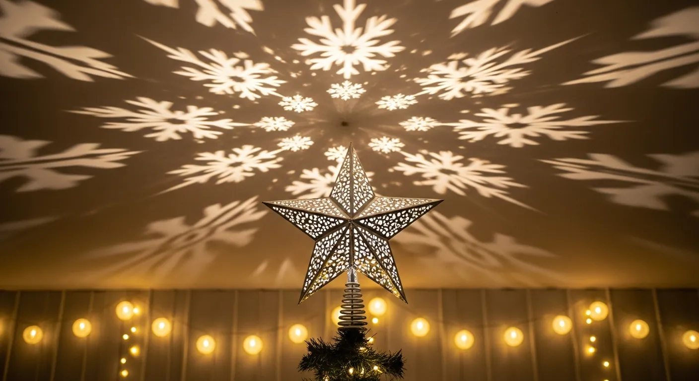 - Star topper projector: animated snowflakes for cinematic ambience after sunset.