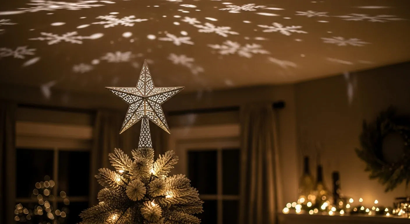 4) Ceiling sparkle: Star Tree Topper with Snowflake Projector