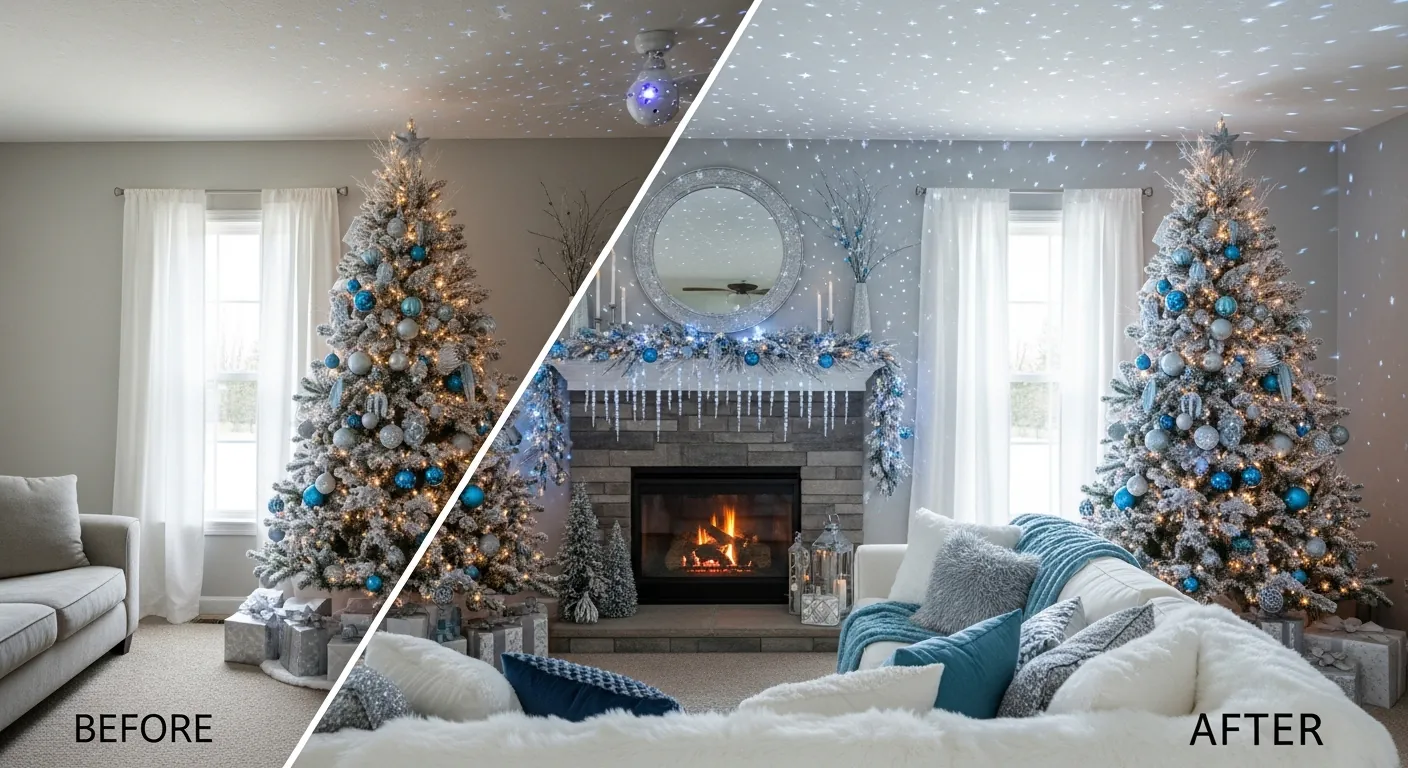 Anchor with the flocked tree, then add glass icicles, blue-and-silver baubles, and a star projector for a layered glow. Finish with faux-fur throws and pillows so the space feels as cozy as it looks under the lights.