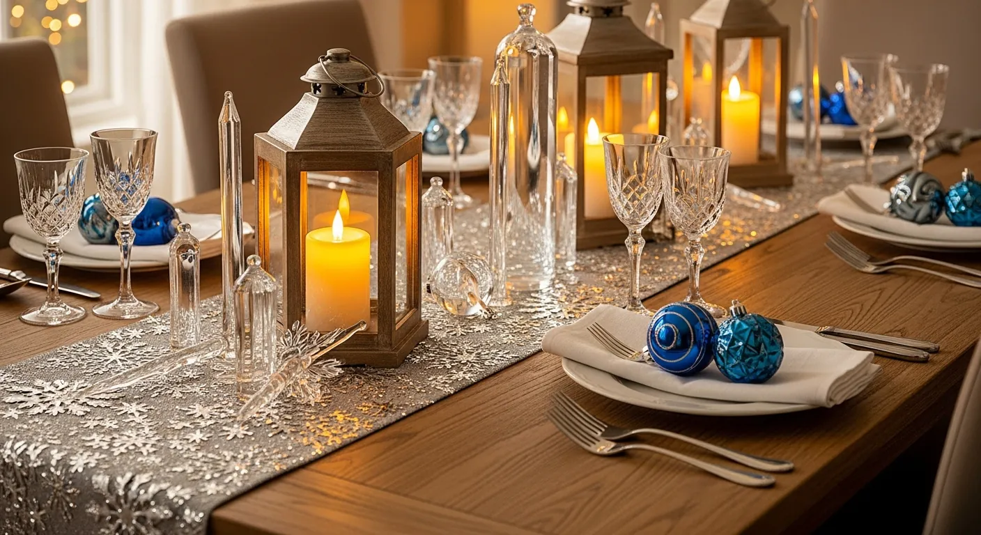 Run a silver snowflake table runner down the center and layer lanterns or flameless candles at varying heights for a luminous tablescape. Add small clusters of blue-and-silver baubles in bowls or on place settings to tie the palette through the meal.